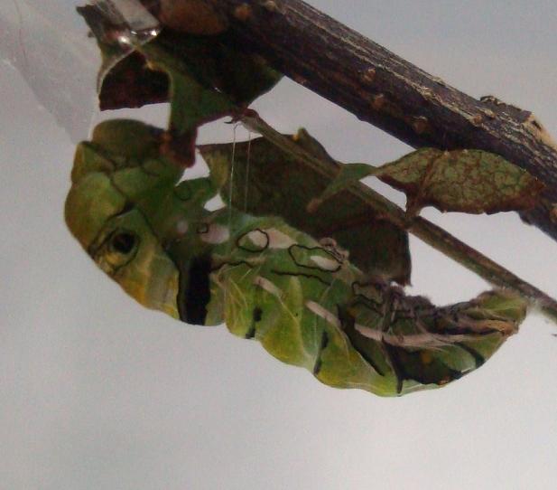 前蛹の場所探しに手間取ってモタついてた子の蛹化が始まる。
