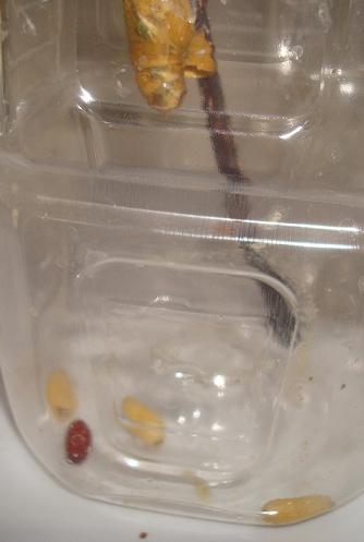 イモの蛹はペットボトルに収容。他の寄生蛹と一緒に火葬します。